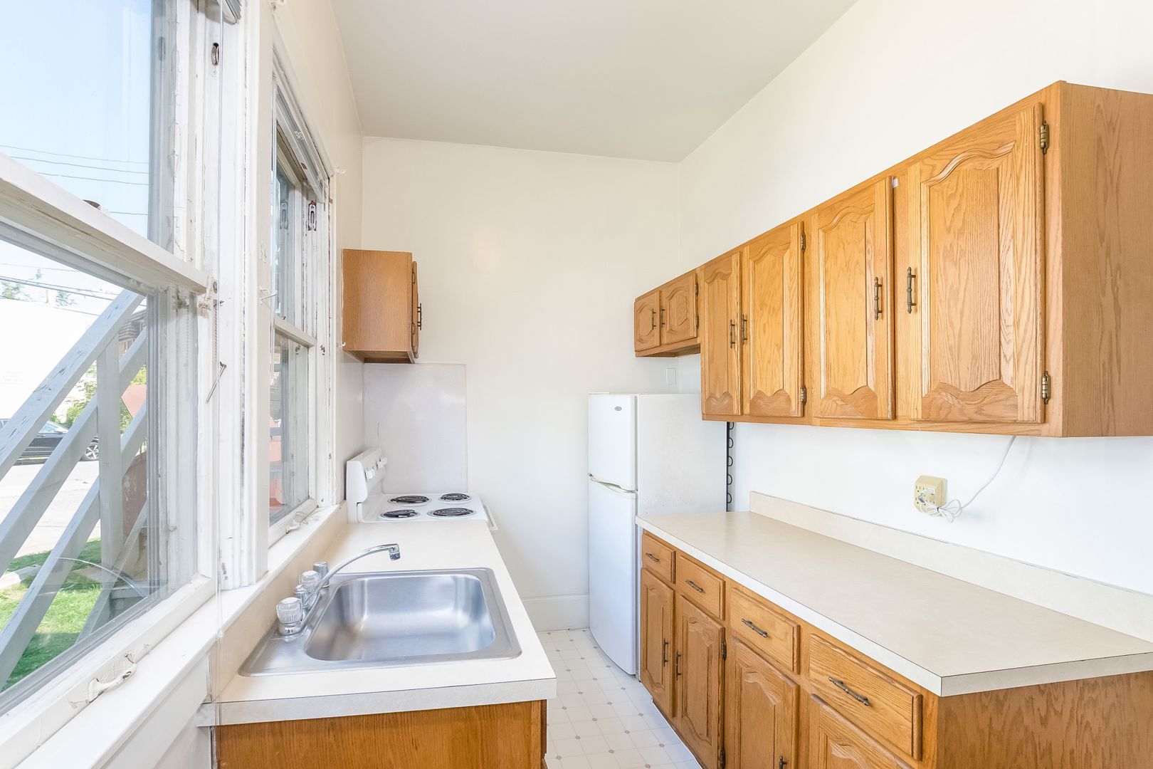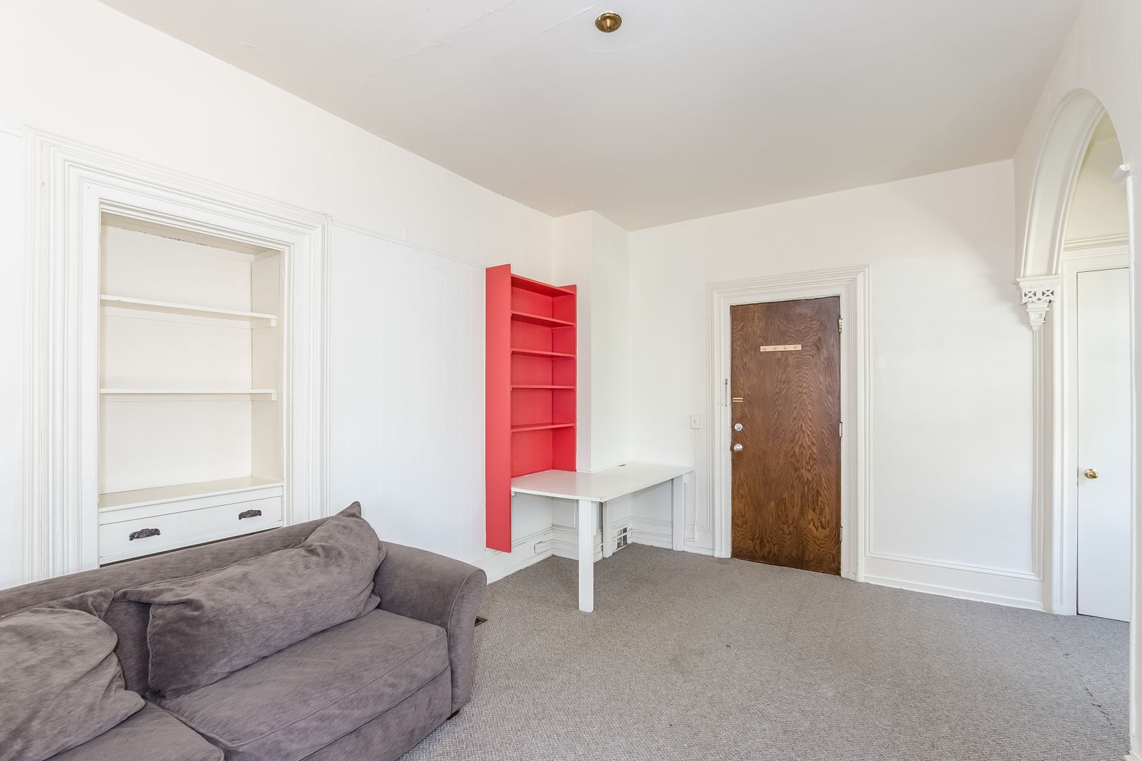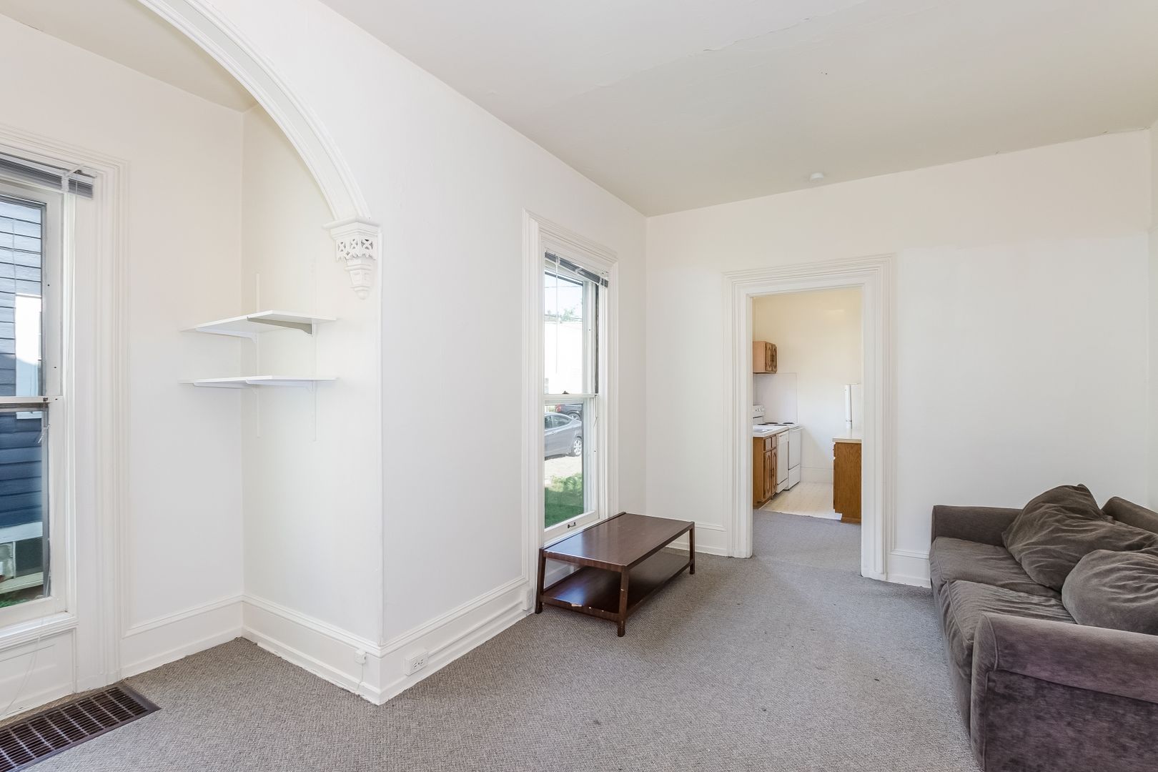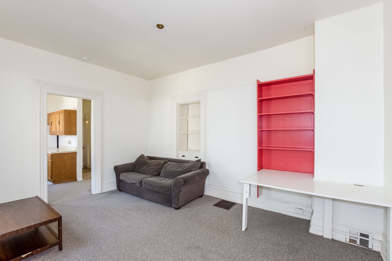 Large living room with high ceilings and built-in bookcases. Newer kitchen with dishwasher . Walk-in closet and additional storage closet.