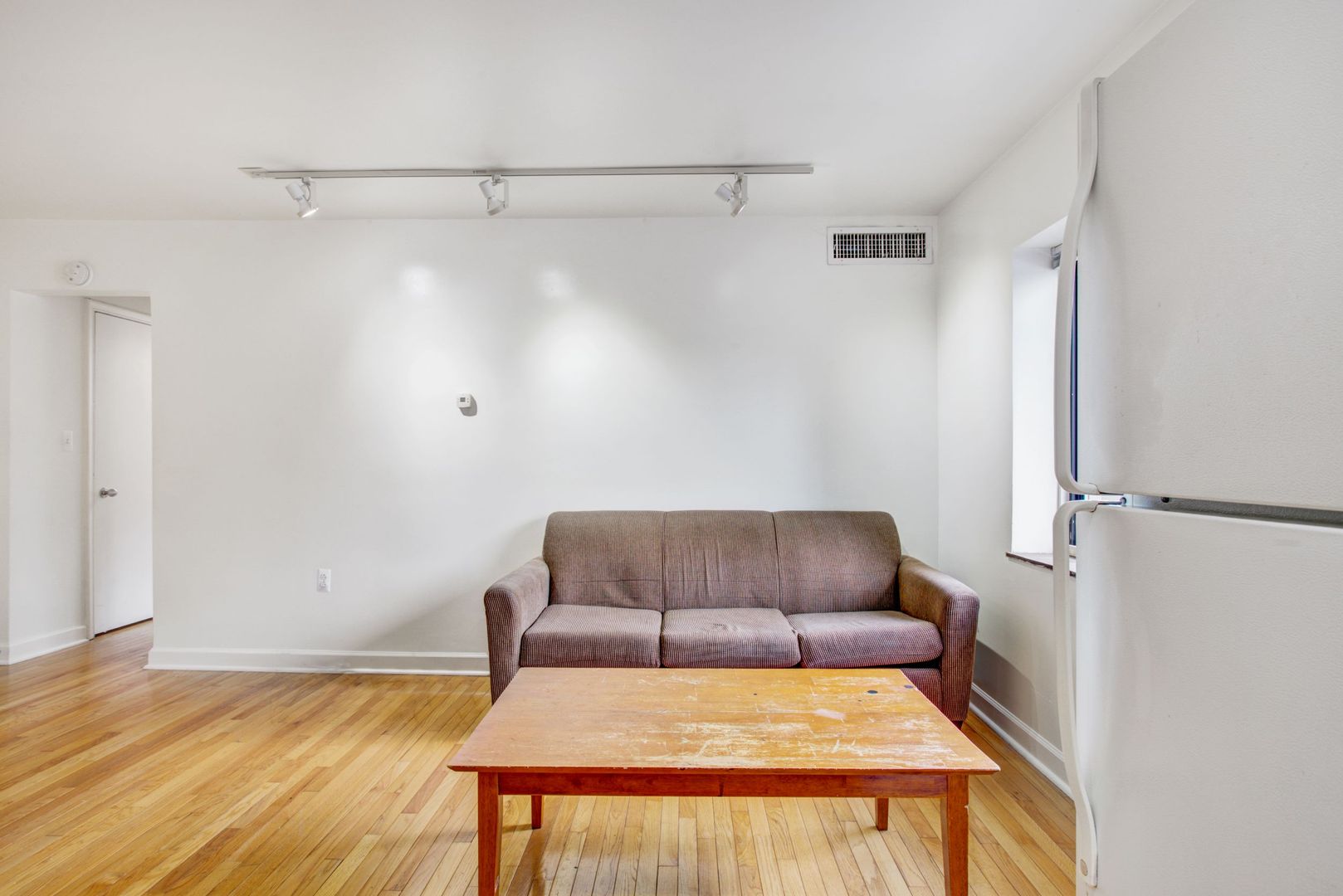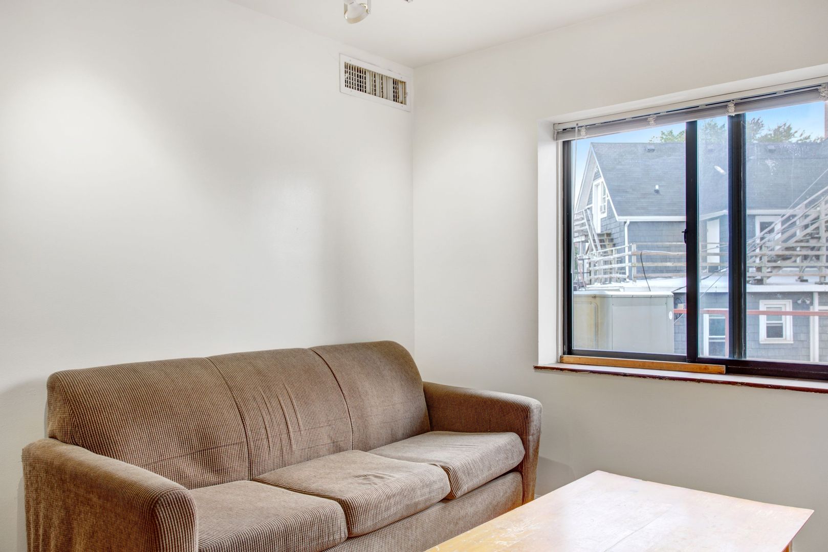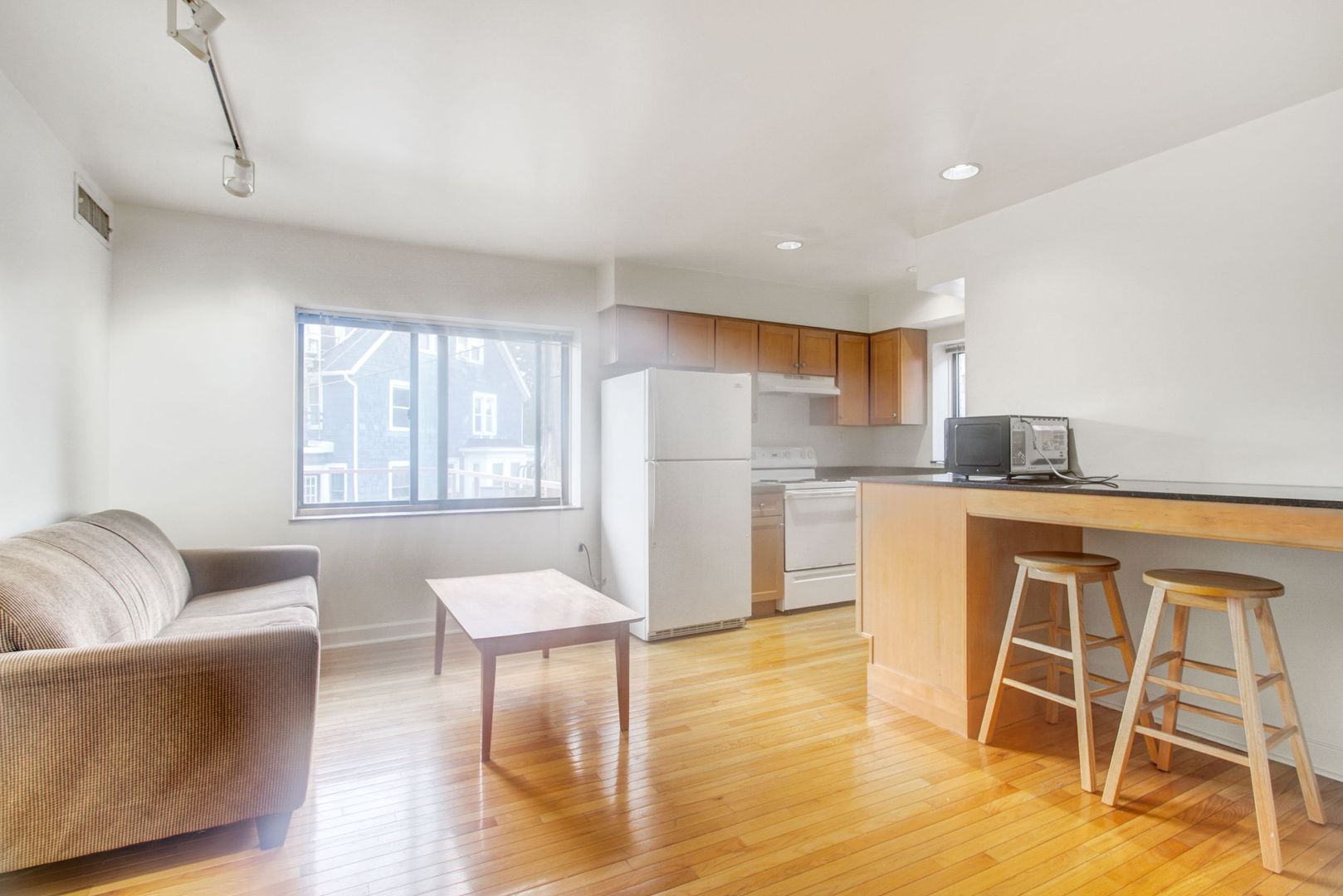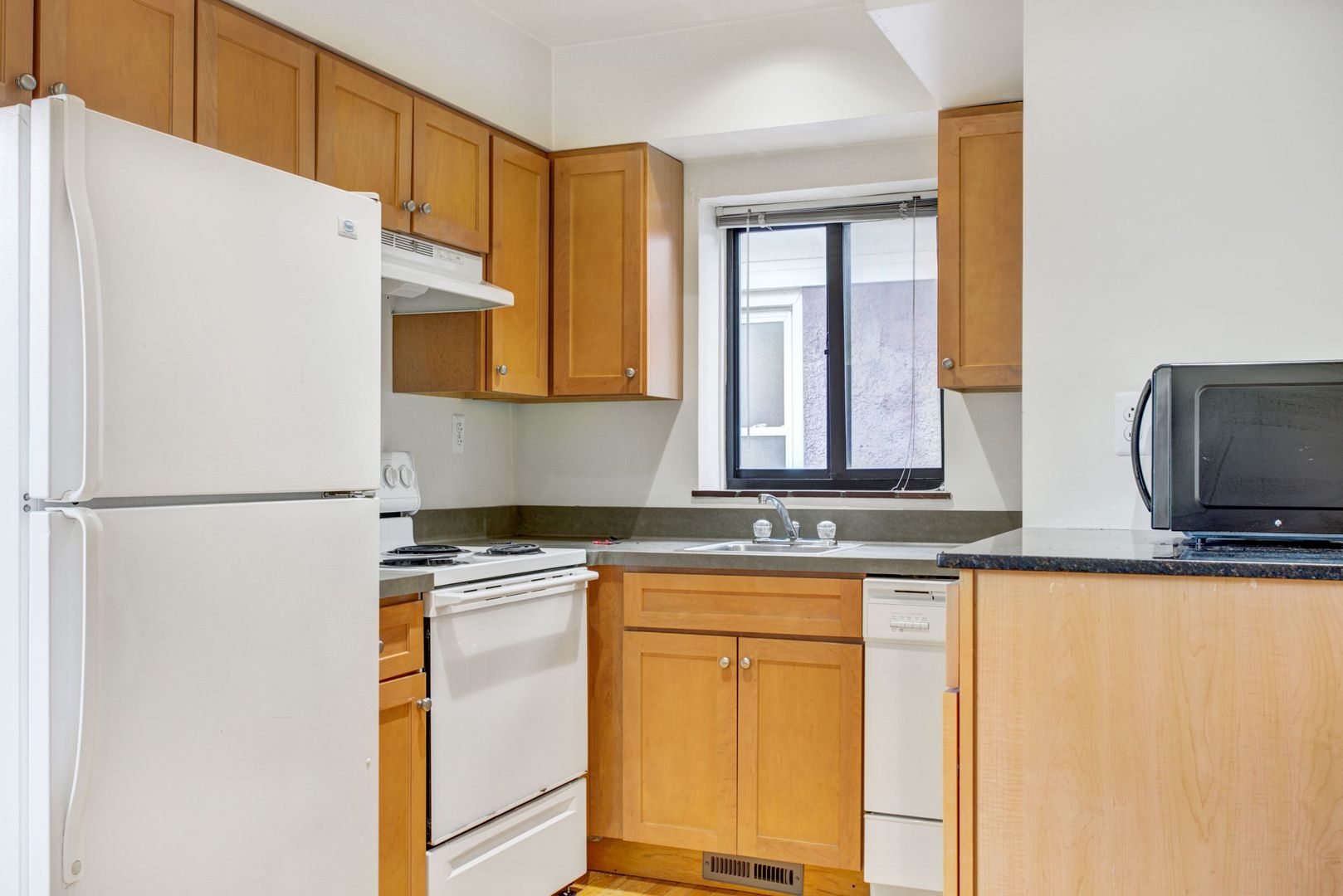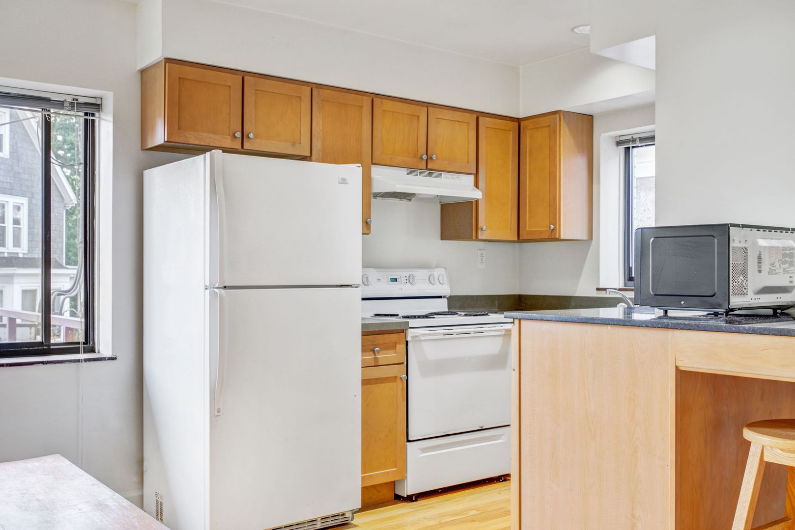 Large living with polished hardwood floors. All new kitchen with maple cabinets, hardwood floor, granite breakfast bar, and newer appliances. Sky-lit ceramic tile bath. A/C in unit.