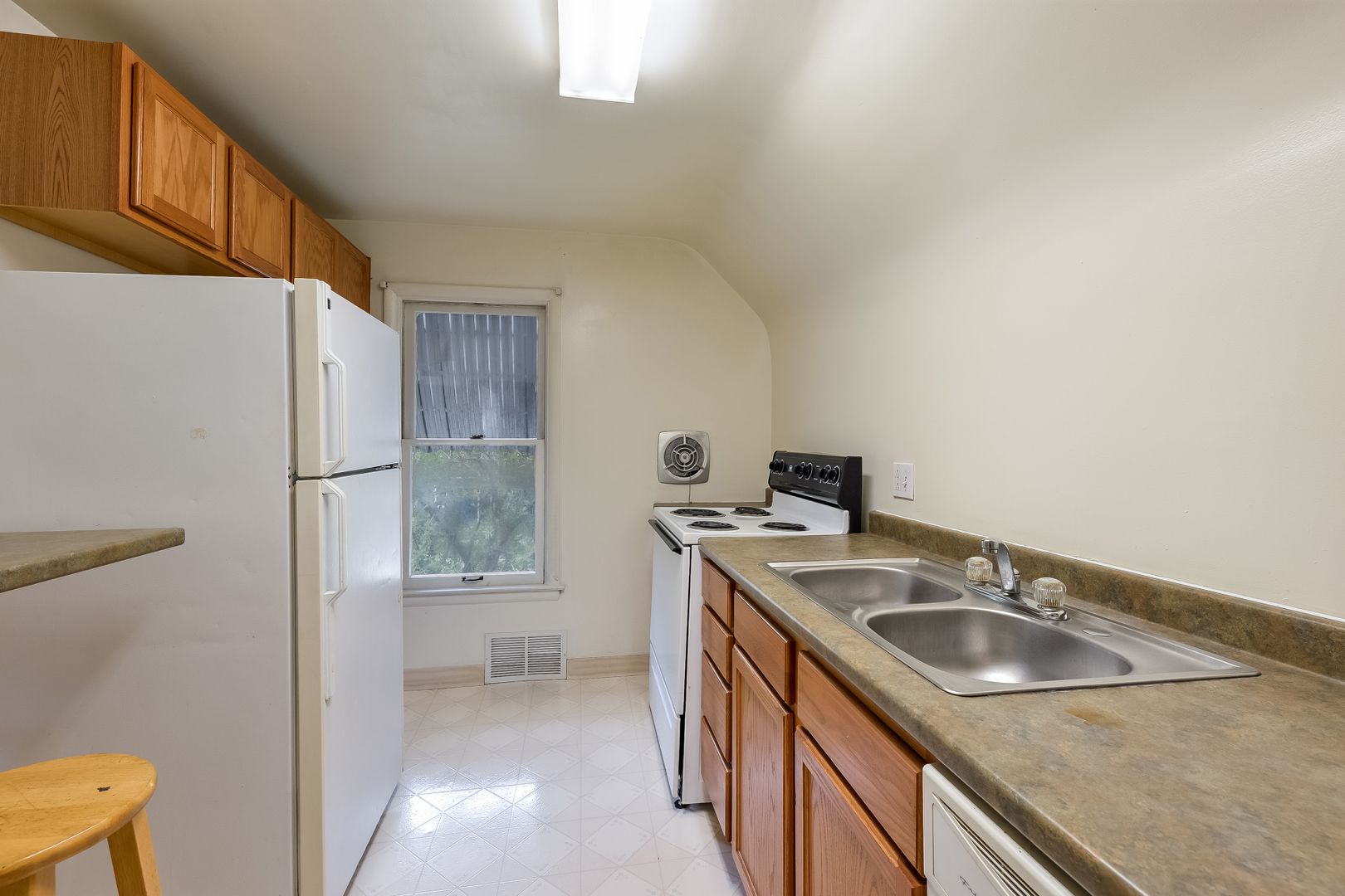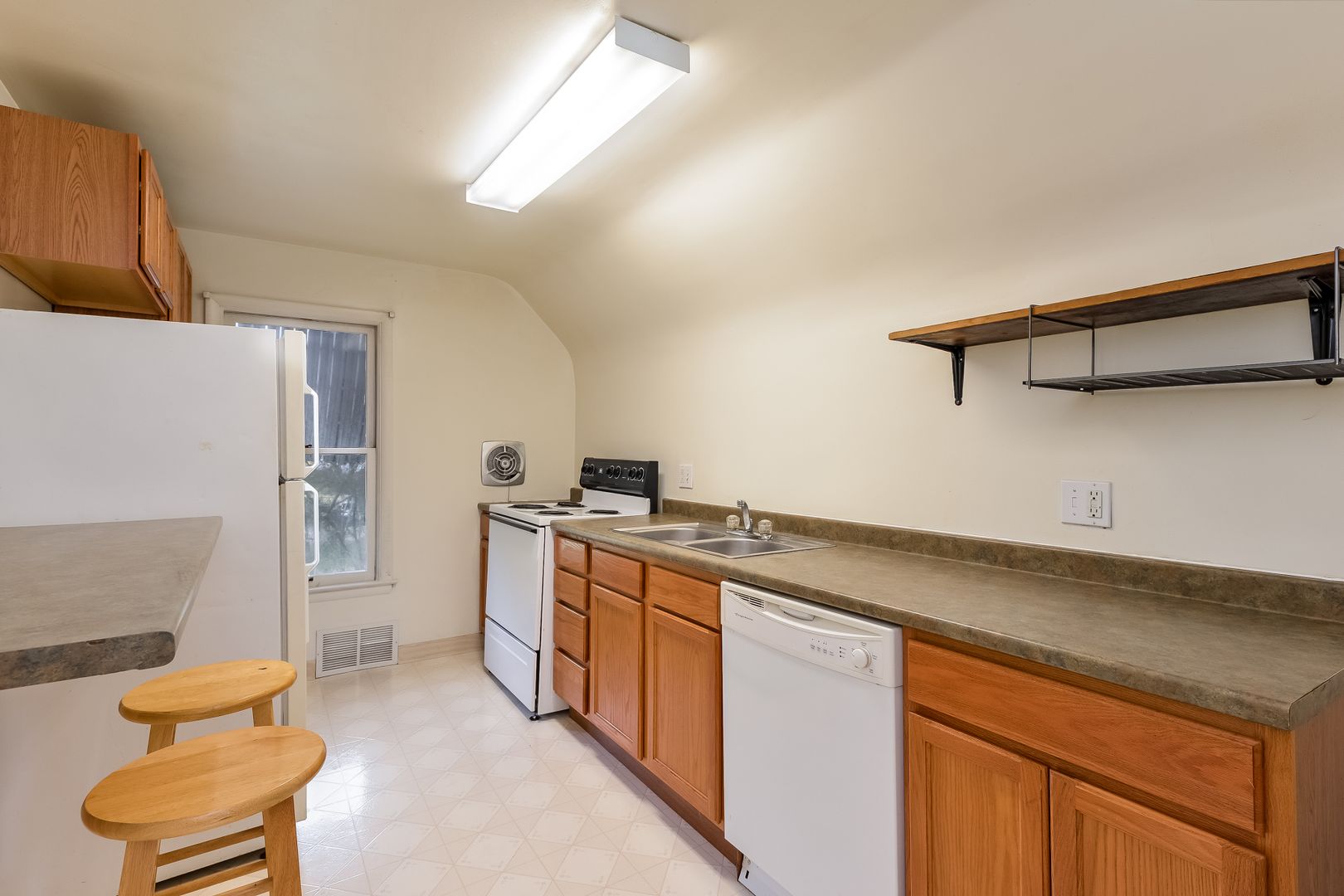 The entire top floor of the house! Gabled bedrooms. Large eat-in-kitchen updated with granite breakfast bar. Large living room with designer track lighting. Laundry onsite. Wall A/C unit.