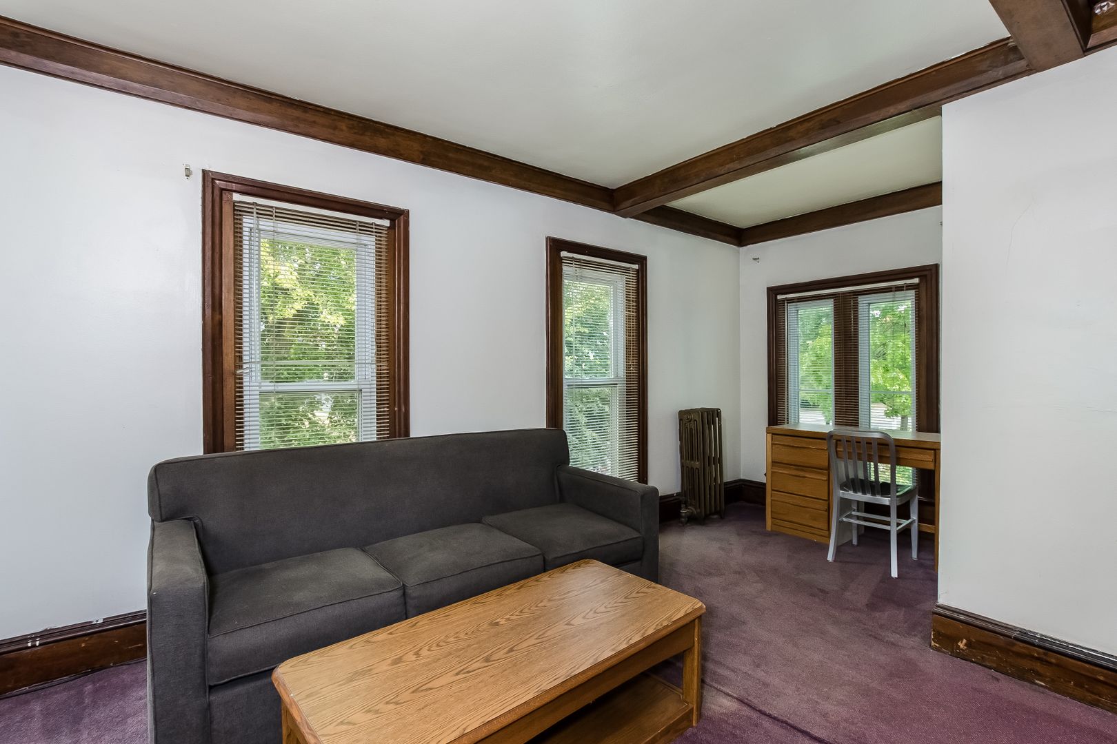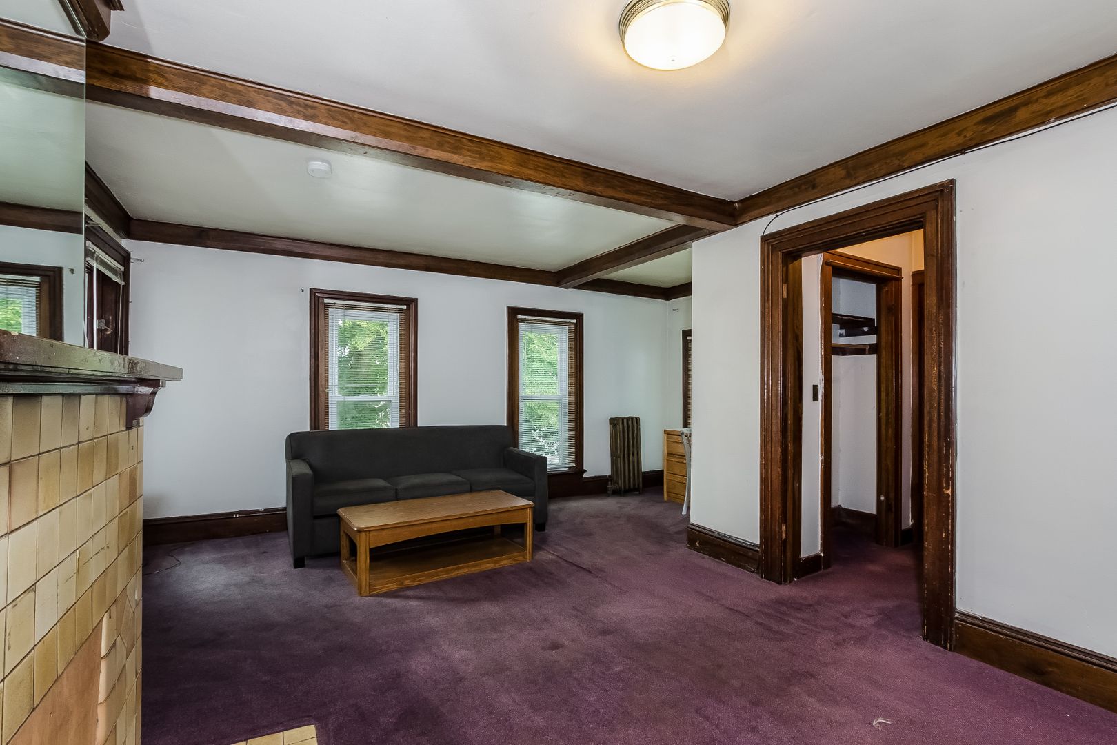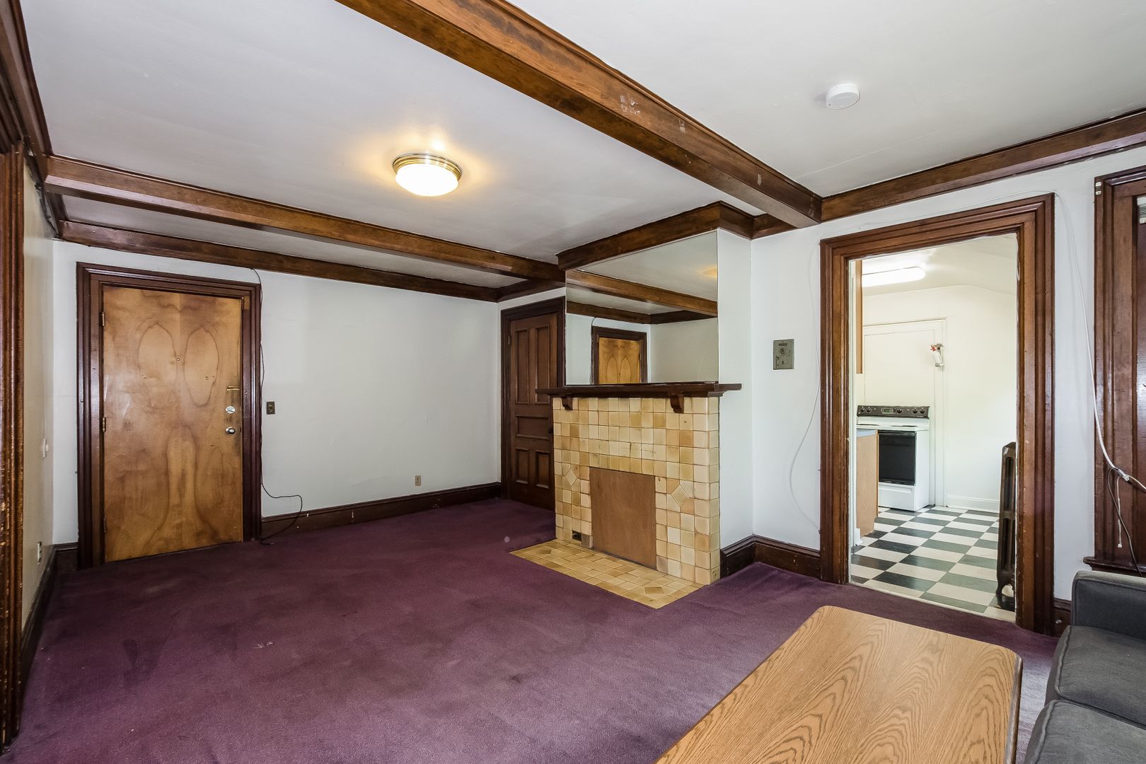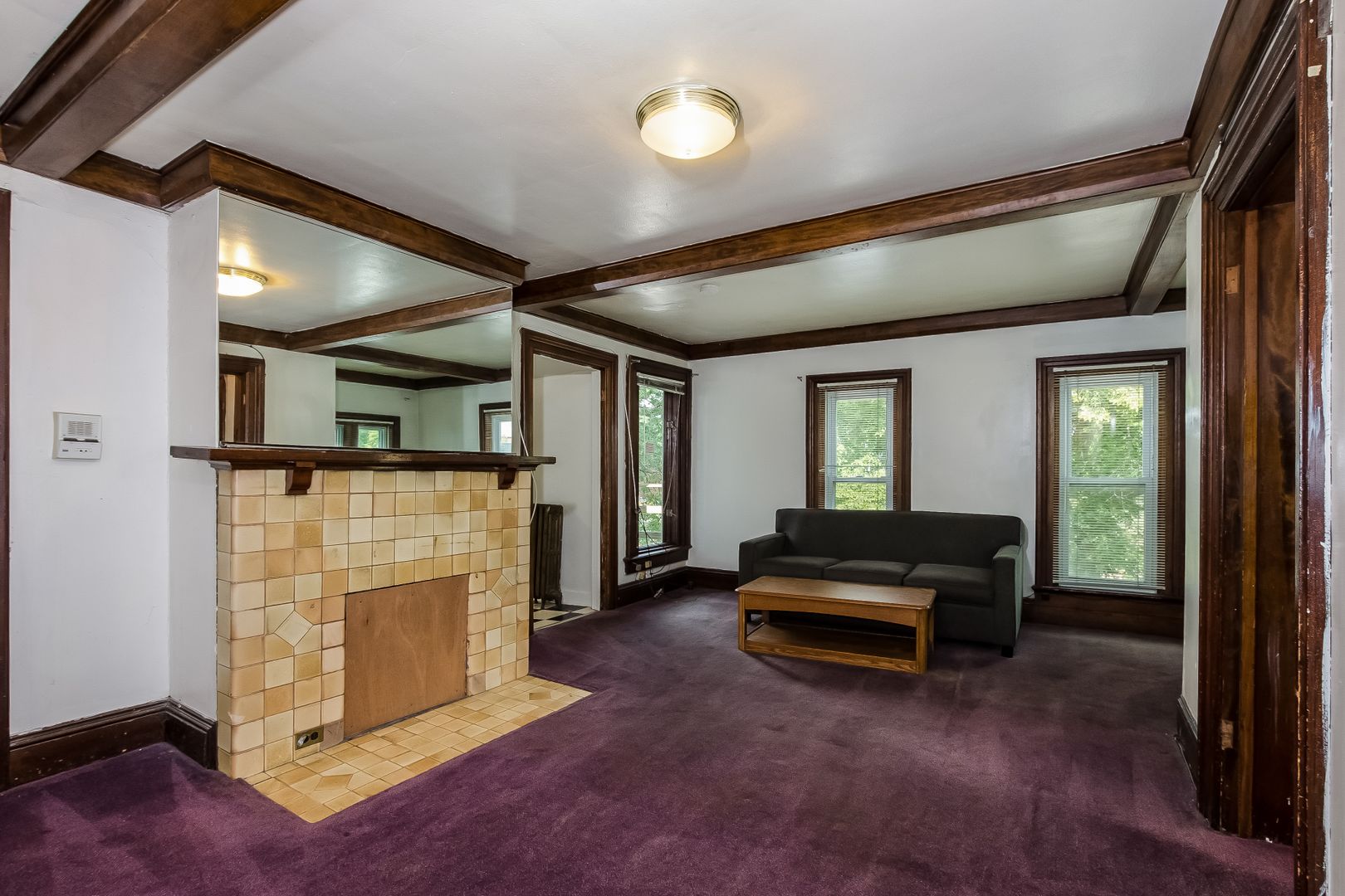 Bi-level apartment with new carpet in large living room featuring a decorative fireplace. Original wood moldings throughout. Laundry onsite.
