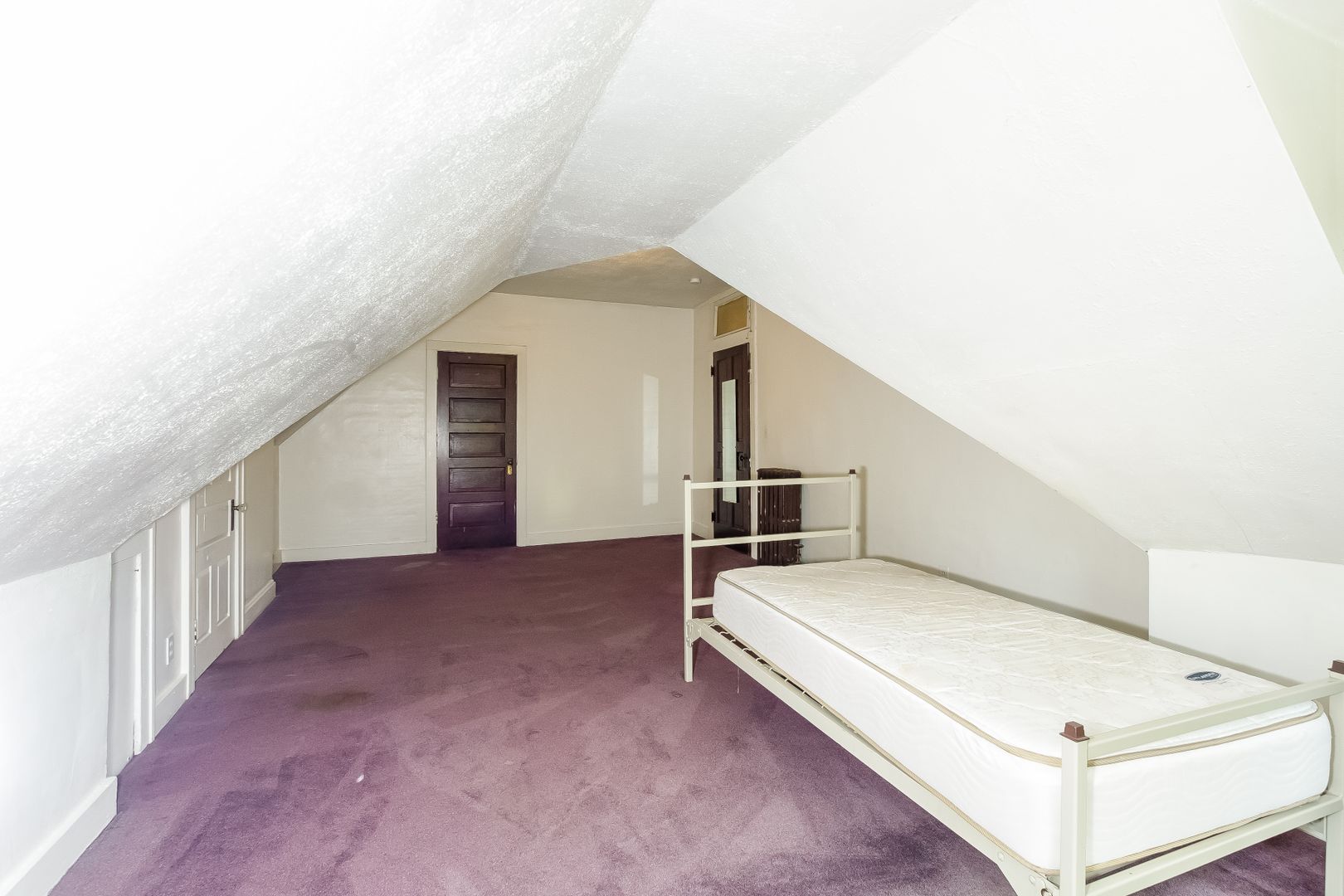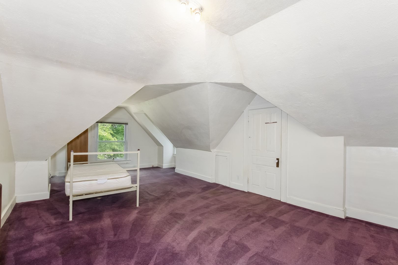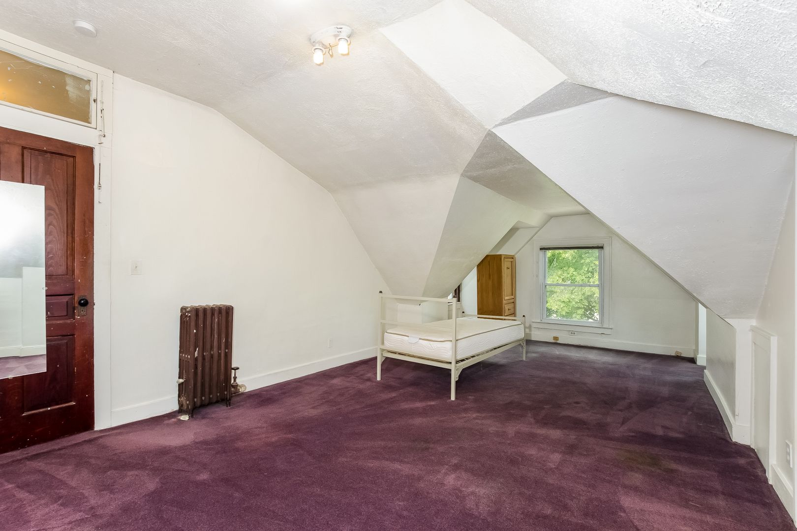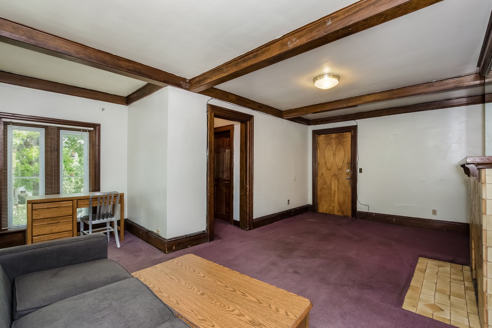 Bi-level apartment with new carpet in large living room featuring a decorative fireplace. Original wood moldings throughout. Laundry onsite.