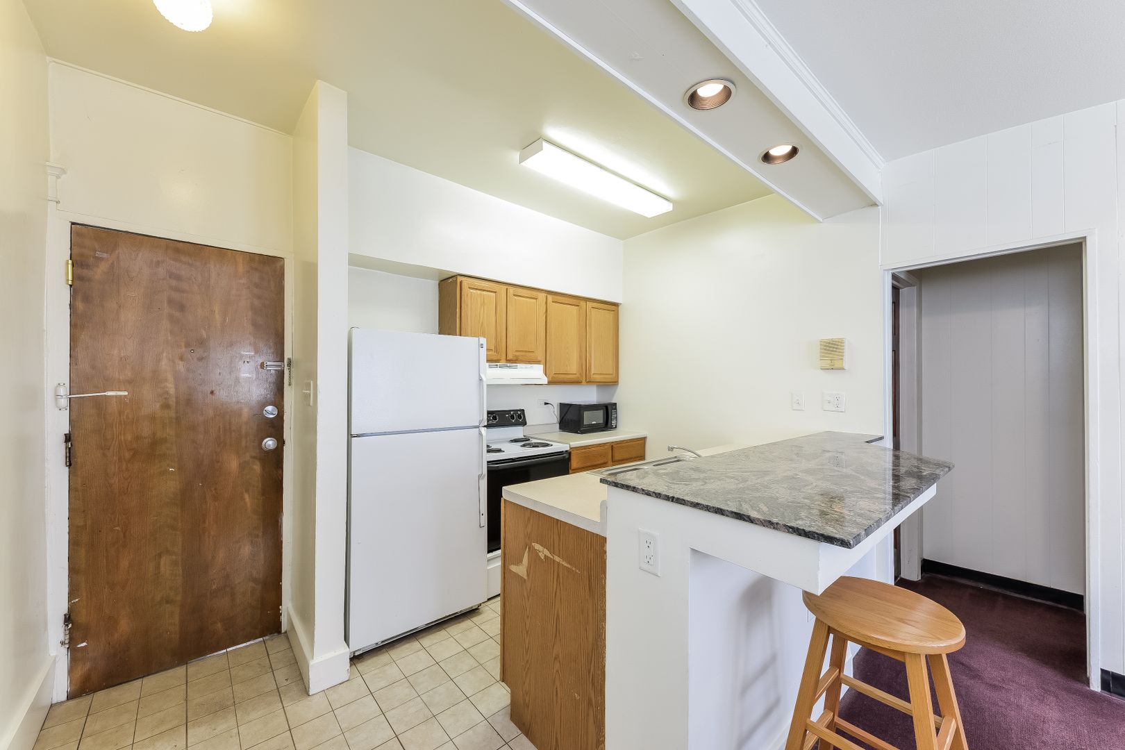 Newer kitchen with granite counter, dishwasher, disposal, and appliances. Newer bath with marble counter and ceramic tile shower. Newer carpet and windows throughout. Window AC Unit.