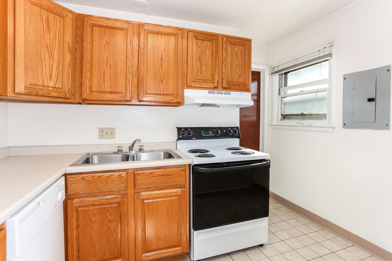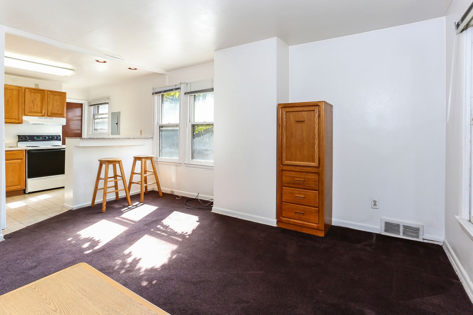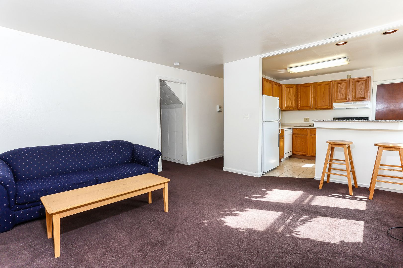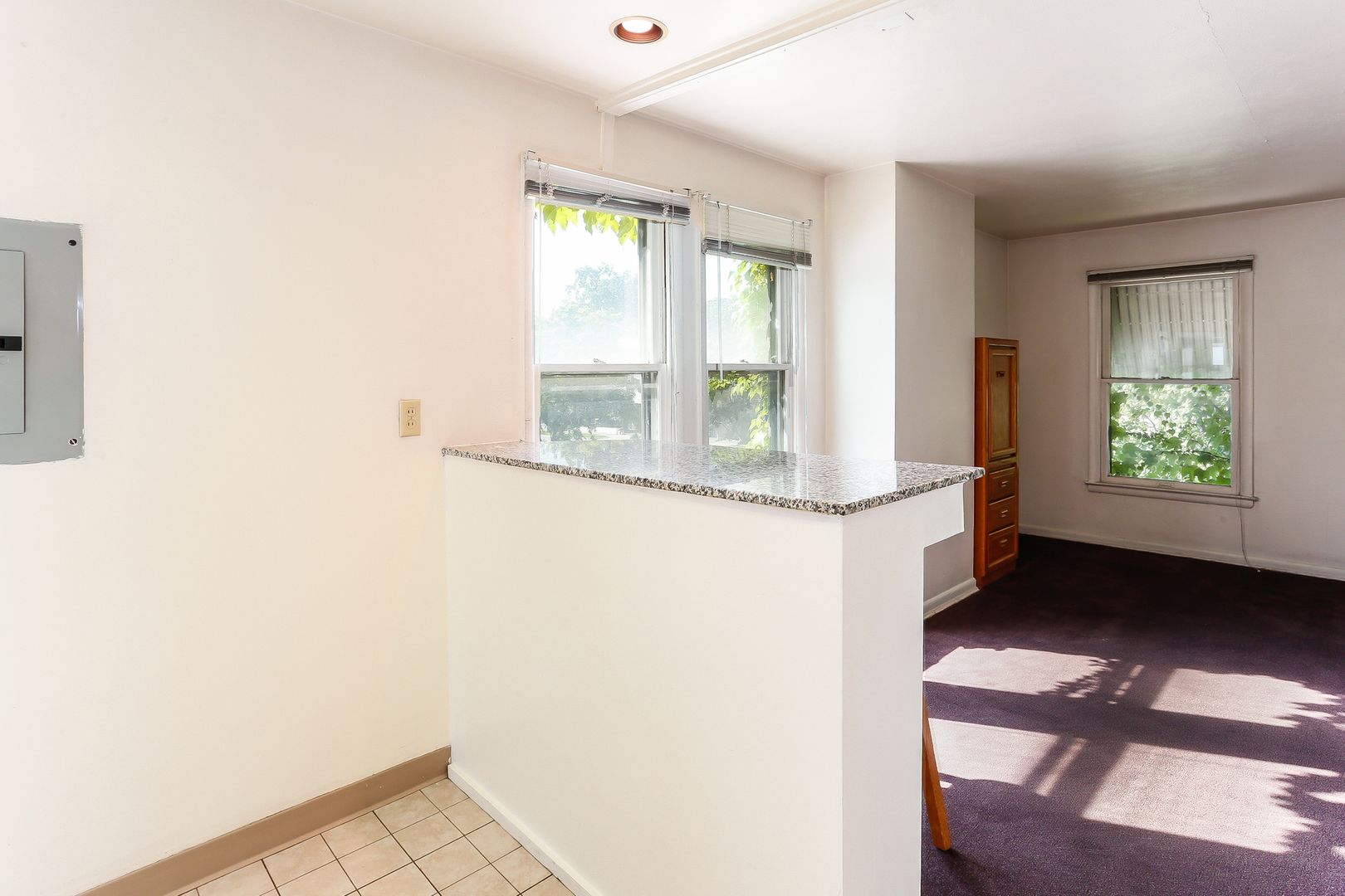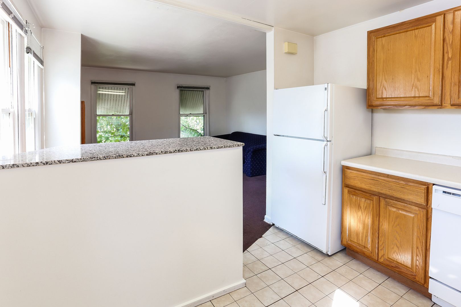 Large, sunny living room. Updated kitchen with granite breakfast bar, dishwasher, and disposal. Laundry onsite. Window A/C unit.